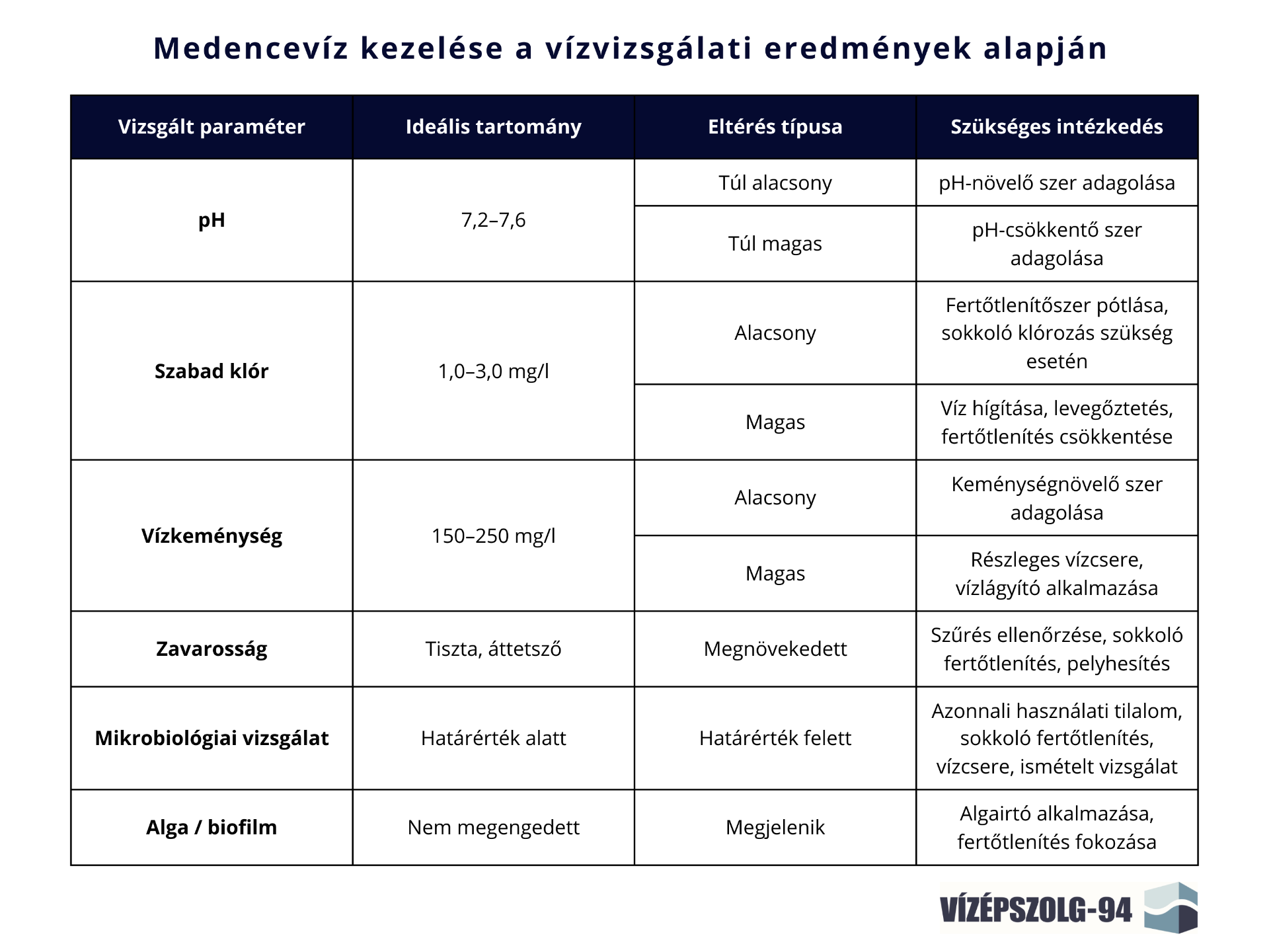 A medencék vizének vizsgálata során az 510/2023. (XI. 20.) Korm. rendelet 6. mellékletében szereplő paramétereket ellenőrizzük.