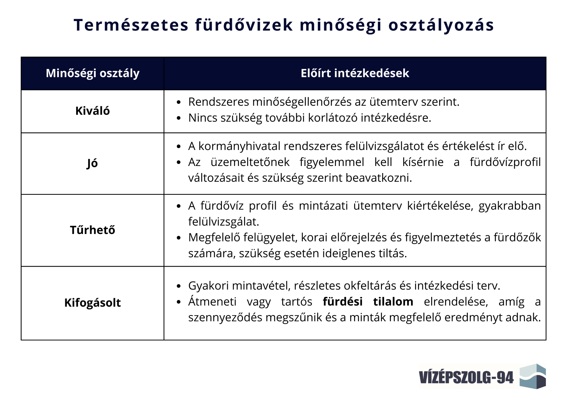 A rendelet a felsorolt paraméterek rendszeresen mért értékei alapján a természetes fürdővizeket négy minőségi kategóriába sorolja, és ennek megfelelően határozza meg a szükséges intézkedéseket.