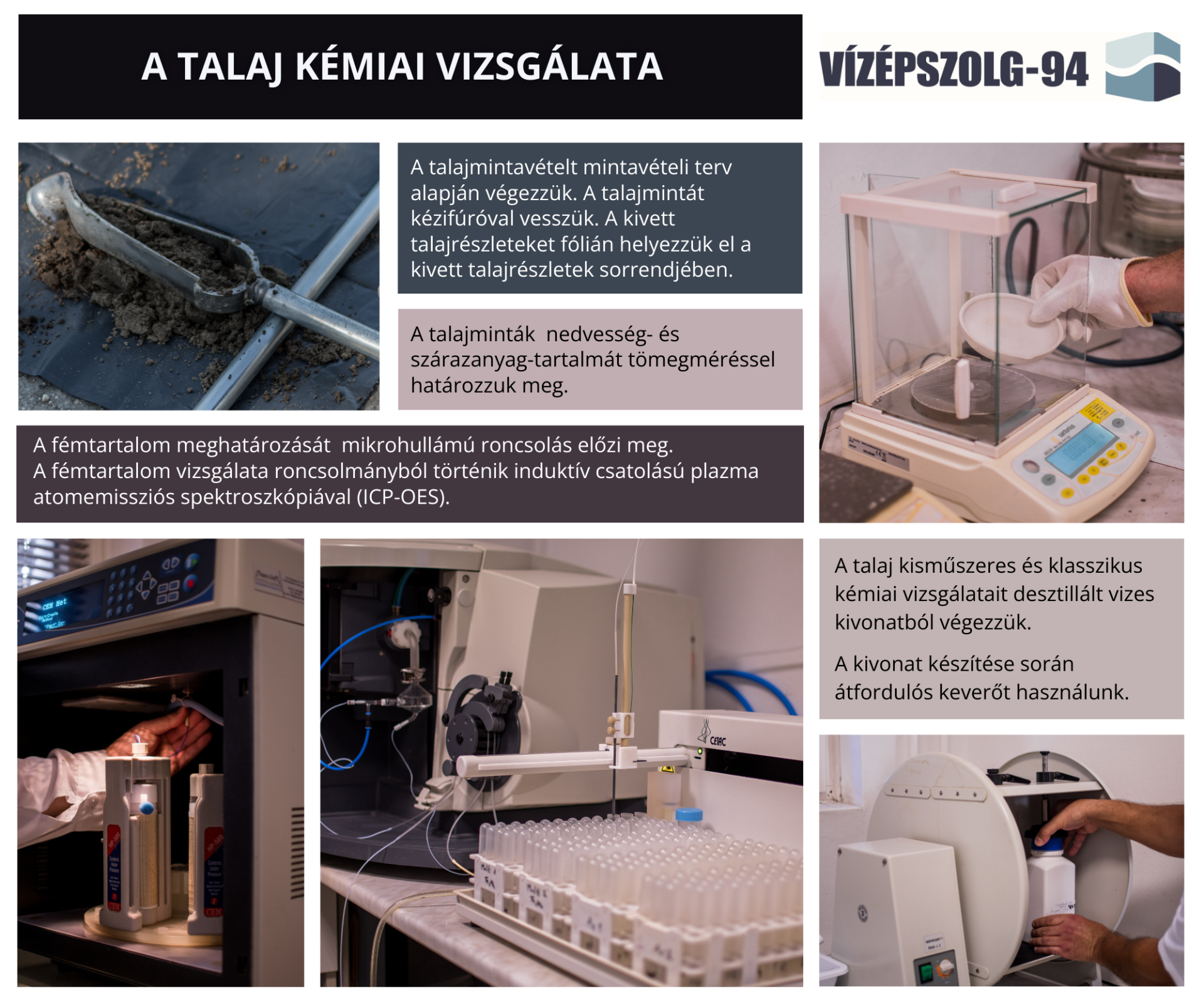 A talajminták kémiai elemzése során a nedvességtartalmat és a szárazanyag-tartalmat tömegméréssel határozzuk meg. A fémtartalom vizsgálata roncsolmányból történik induktív csatolású plazma atomemissziós spektroszkópiával (ICP-OES). A kisműszeres és klasszikus kémiai vizsgálatokat desztillált vizes kivonatból végezzük.